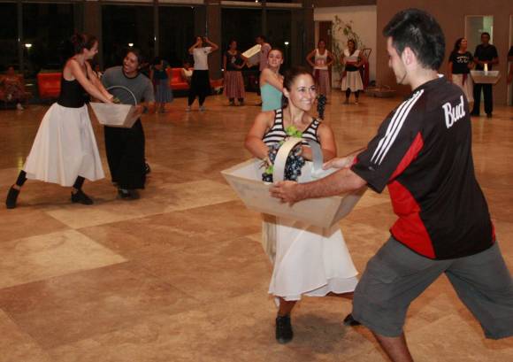 En el Foyer Sur del Auditorio Juan Victoria, los bailarines y músicos que forman parte de la delegación que encarnará La noche de San Juan en Cosquín -el viernes 20 de enero- realizan los ensayos generales de lo que será la estampa "El vino: bebida nacional". El elenco tendrá 18 minutos para exponer en metáforas el valor cultural que tiene el vino. La puesta arrancará apoyada con imágenes en video, con "Las doce uvas", una tonada que introducirá a los espectadores en clima junto a la interpretación de los Hermanos Cantos. En el segundo cuadro de la siembra estará "La cuna del vino", un gato de Kuky Vega y Poncho Cortéz, los creadores del espectáculo. Después vendrán los cuadros de la cosecha, con la canción ‘La vendimia es una niña’ de Gustavo Troncoso; y a continuación será el momento para la elaboración del vino con la chacarera de Mario Zaguirre "Yo soy el vino". Luego vendrá "El vino nuevo" con un malambo y la personificación teatral de Pascual Recabarren representando al vino. Y para el cierre, Los Solistas de San Juan interpretarán "Canción para un encuentro", un clásico de Chico Novarro popularizado a su versión folklórica por Inti Huama. Y en esta parte habrá una sorpresa para el público de Cosquín, con la participación de Claudia Pirán.