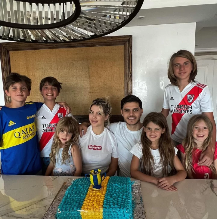"Mi familia", escribió la empresaria en Instagram junto a una foto en familia donde está acompañada por Mauro Icardi y todos sus hijos. En una segunda imagen reveló el relleno del divertido pastel.