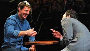 Ante una docena de huevos, ocho huevos duros y cuatro crudos, Tom debía elegir aquellos que no se rompieran en su frente. Pero en su primera elección, Cruise escogió mal y terminó con la cabeza toda sucia.