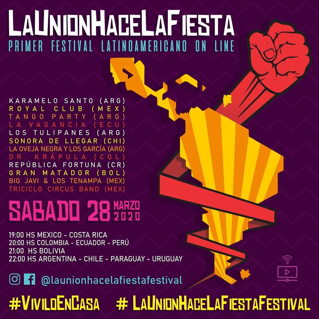 El show se transmitirá el próximo sábado 28 de marzo de 2020 en las redes sociales bajo el hashtag @launionhacelafiestafestival, a las 22:00 de Argentina, Chile, Paraguay y Uruguay; 19:00 México y Costa Rica; 20:00 Ecuador y Perú; y 21:00 Bolivia.