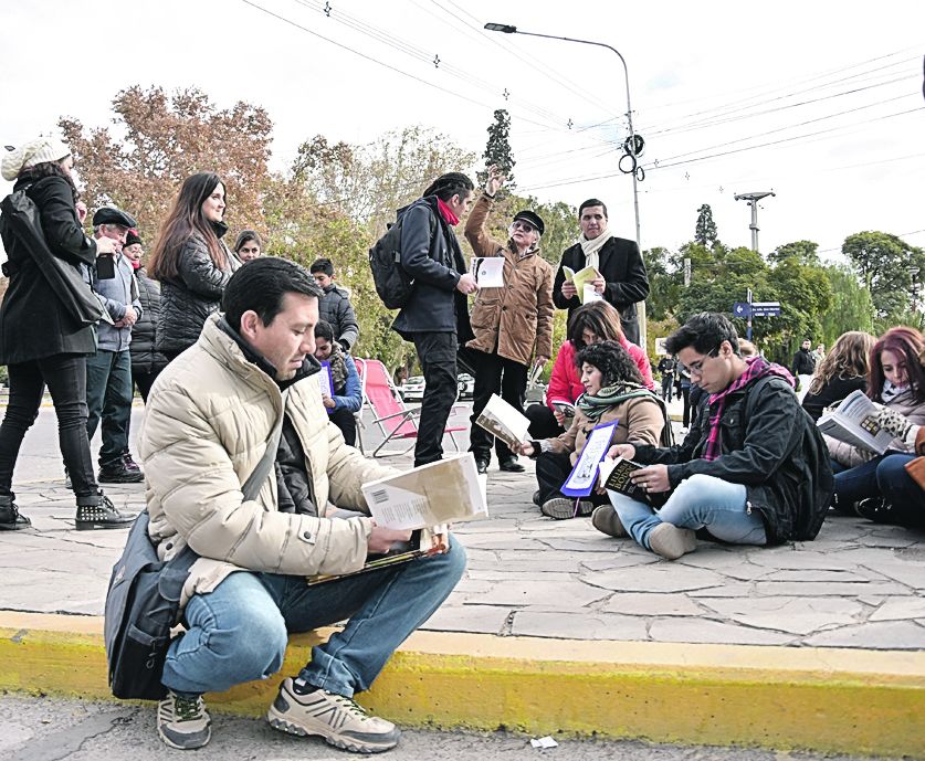Con el propósito de fomentar y promover la lectura participativa y abierta, la Dirección de Bibliotecas Populares llevó a cabo una ronda itinerante que consistió en varias intervenciones del espacio público para que los textos de autores locales circulen por las calles. Ayer, en el Día Nacional del Libro, jóvenes y adultos, algunos curiosos, representantes de bibliotecas y funcionarios, sacaron los libros de los estantes en la rotonda de Avenida Libertador y Las Heras, la explanada del Centro Cívico y la Plaza 25 de Mayo. Los promotores transitaron usando pancartas con consignas que expresaban la importancia de los libros, un megáfono fue utilizado para llamar la atención y un marco hecho con materiales rudimentarios para las fotos con destino a publicarse en Facebook. A tal punto, el ruido y la movilización despertó la atención de la guardia de seguridad del edificio, que al pensar que se trataba de una protesta, no dejaron entrar a los promotores, pero eso no impidió a que la manifestación para incentivar la lectura se interrumpiera. Porque algunos espectadores ocasionales se sumaron a participar y llevaron consigo libros para compartir e intercambiar algunas lecturas.