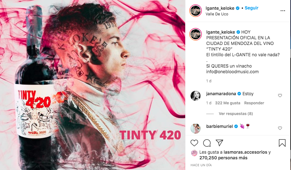 “Hoy presentación oficial en la Ciudad de Mendoza del vino ‘Tinty 420′. ¿El tintillo del L-GANTE no vale nada?”, escribió en su cuenta personal de Instagram L-Gante. Enseguida la publicación fue invadida por mensajes para conseguir el vino y el primer pedido vino por parte de Jana Maradona, quién le aseguró que le hará llegar un par de botellas y más tarde por Sebastian Yatra quién recibió un ‘like’ por parte del cantante.