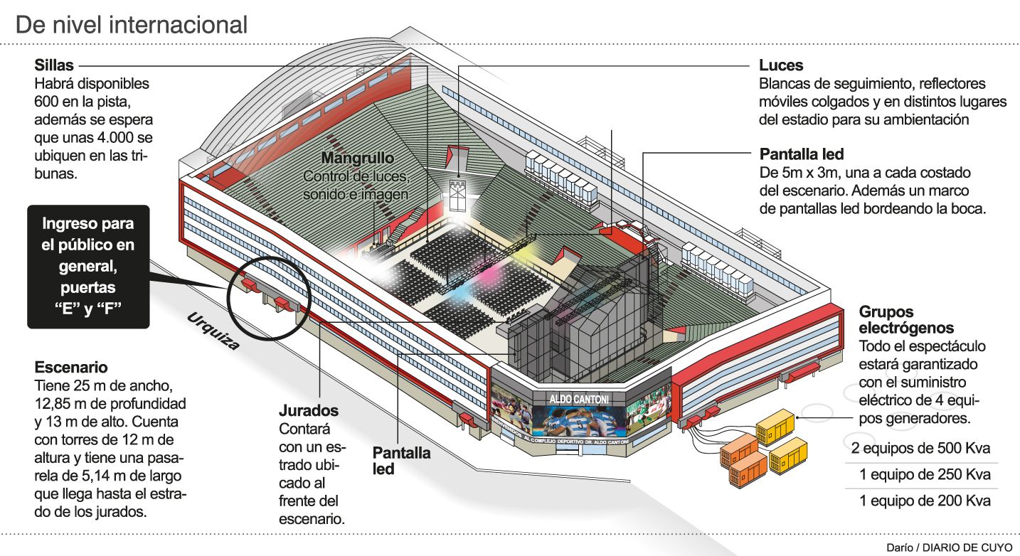 El escenario, que está instalado del lado sur del estadio por calle San Luis, cuenta con más de 25 metros de boca, lleva dos torres a 12 metros de altura, donde el impacto visual tendrá un efecto importante para los espectadores. En las mismas, habrá pantallas de led con más de 250 metros cuadrados, con los rieles necesarios para las aperturas en vivo tal como sucede en cada emisión del programa. Además, hay un sistema de iluminación traído de Brasil, con más de 150 móviles colgados; habrá móviles satelitales de más de 20 metros de largo, un set de 15 cámaras HD, con grúas, sistemas de travelling, de piso, steadycam, frontales y laterales.