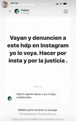 “Ojalá le agarre cáncer a tus tres hijas, cuidalas bien”, se puede leer en la historia de Instagram que compartió Fernández. La indignación de Cinthia la llevó a compartir el mensaje con sus seguidores y hacerles un pedido a quienes le demuestran siempre su cariño.