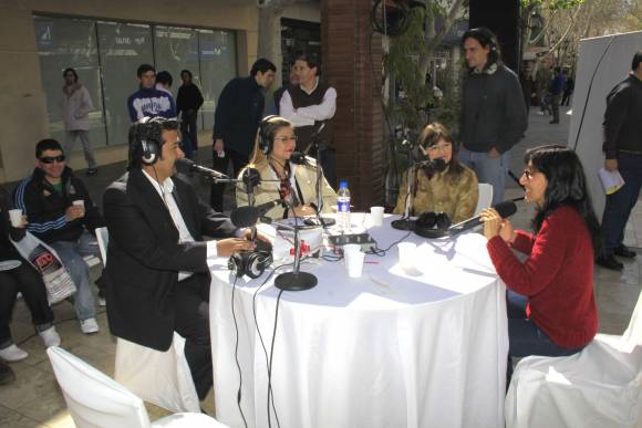 Ayer sábado, LV5 Radio Sarmiento celebró sus 85 años con una emisión especial: transmitió con buena parte de su equipo, desde la peatonal. Bien instalados, recibieron la visita de oyentes y autoridades -entre ellas el Gobernador Gioja y el Intendente Lima- y compartieron con los transeúntes la tradicional torta.