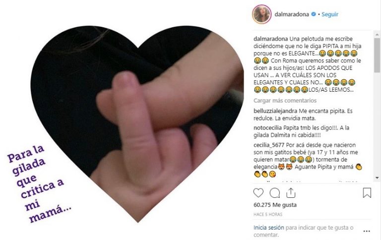 “Con Roma queremos saber como le dicen a sus hijos/as! LOS APODOS QUE USAN … A VER CUÁLES SON LOS ELEGANTES Y CUALES NO… LOS/AS LEEMOS…“, agregó con furia y adjuntó una foto de la pequeña haciendo un gesto obsceno.