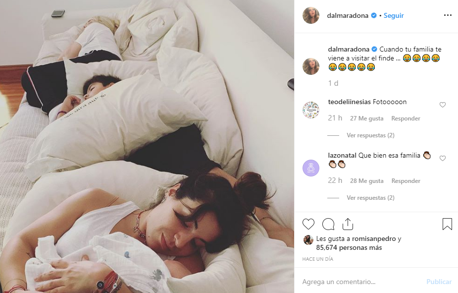 “Cuando tu familia te viene a visitar el finde”, escribió Dalma junto a varios emoticones de felicidad. En la imagen se puede ver a su madre Claudia, durmiendo en un enorme sillón junto a su sobrino Benjamín y su hermana Gianinna que tiene en brazos nada más y nada menos que a su hija Roma.