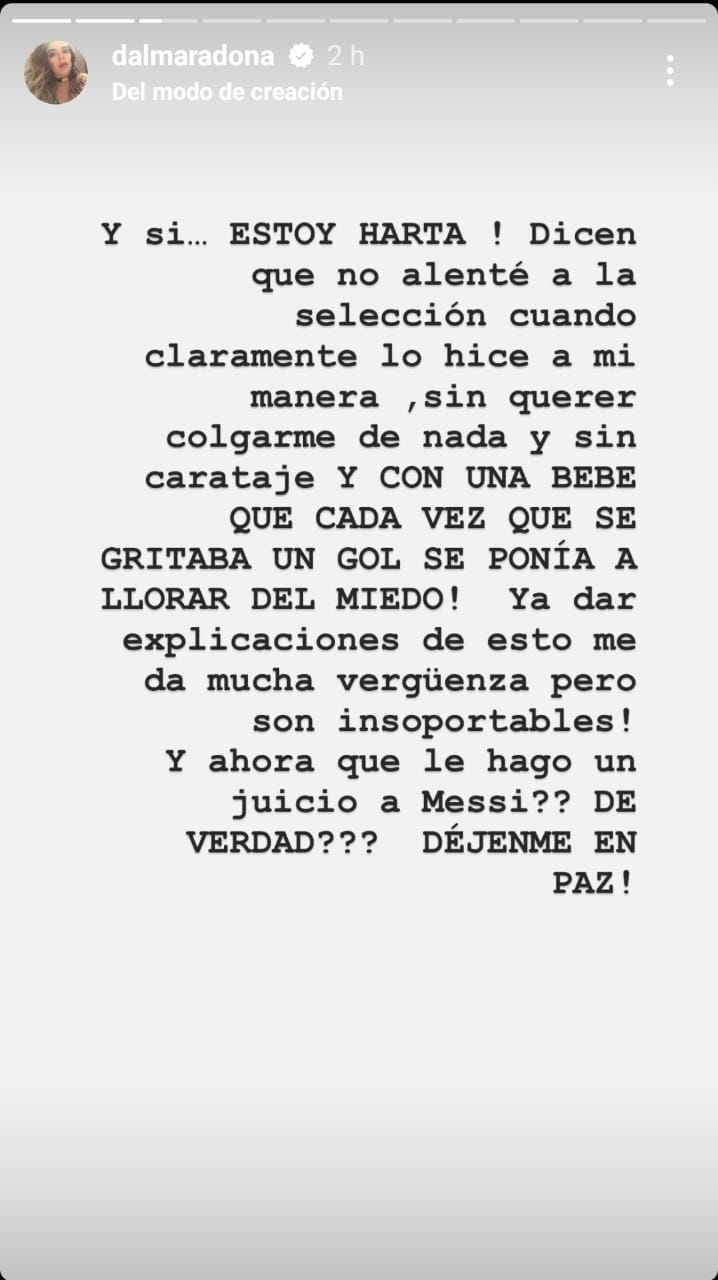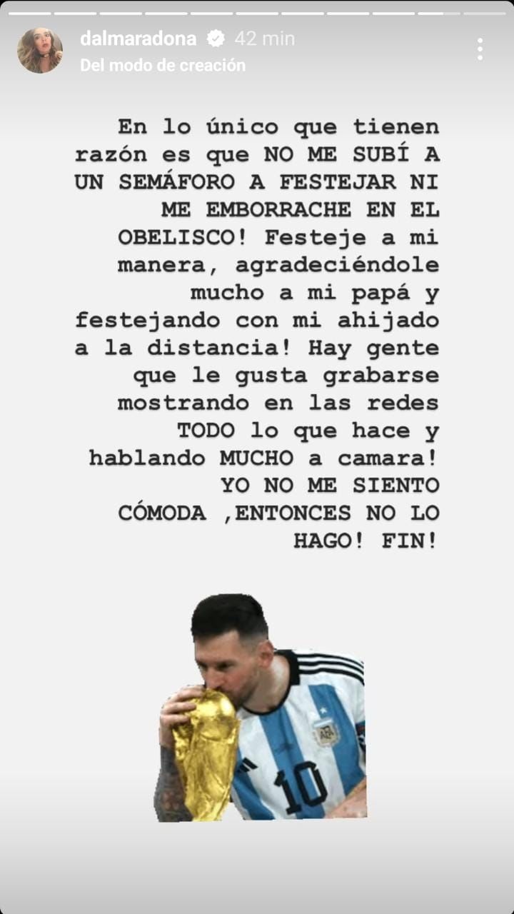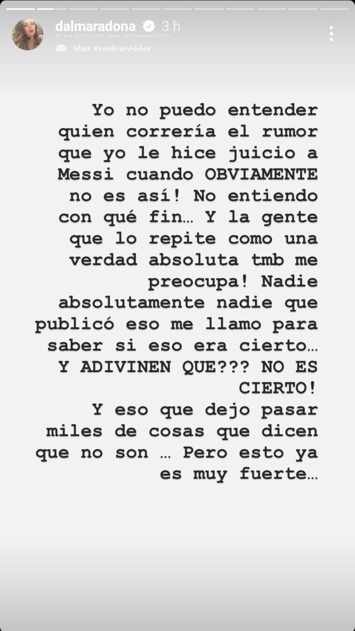 "Yo no puedo entender quien correría el rumor de que yo inicié un juicio a Messi cuando claramente no lo hice. Nadie que corrió el rumor me vino a preguntar", comenzó diciendo Dalma. "Dejo pasar miles de cosas, pero esto ya es muy fuerte. Además, dicen que no alenté a la elección y claramente lo hice a mi manera, sin caretear ni colgarme de nadie", agregó antes de finalizar su descargo.
