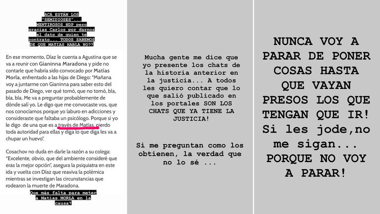Ante esto, y tras la desmentida constante de Morla de su vínculo con quienes cuidaban a Diego, Dalma se preguntó irónicamente en sus redes: "Acá están los ‘semidioses’, mentirosos hdp (sic), pero gracias Carlos por darnos el dato de quién te contrató. Todos sabemos de qué Matías habla, ¿no?". Después, fue contundente: "¿Qué más hace falta para meter a Matías Morla en la causa?".