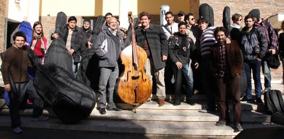 Ayer por la mañana, los participantes del Encuentro Internacional de Contrabajos "Contrastes VII" -organizado por Nelson Videla, con apoyo del Gobierno provincial y que se extenderá hasta el próximo lunes-, se reunieron en la puerta de la Iglesia Catedral, desde donde partieron los colectivos que los trasladaron al complejo ubicado en el Dique de Ullum, donde nuevamente hacen base. Armados de sus portentosos instrumentos y atriles, brindaron una breve pero curiosa postal para los ocasionales transeúntes. En Del Bono Beach, además de hospedarse, se desarrollan las clases magistrales e individuales, el primer concurso de contrabajo, los ensayos y también algunas presentaciones (como el concierto de los alumnos, el sábado).