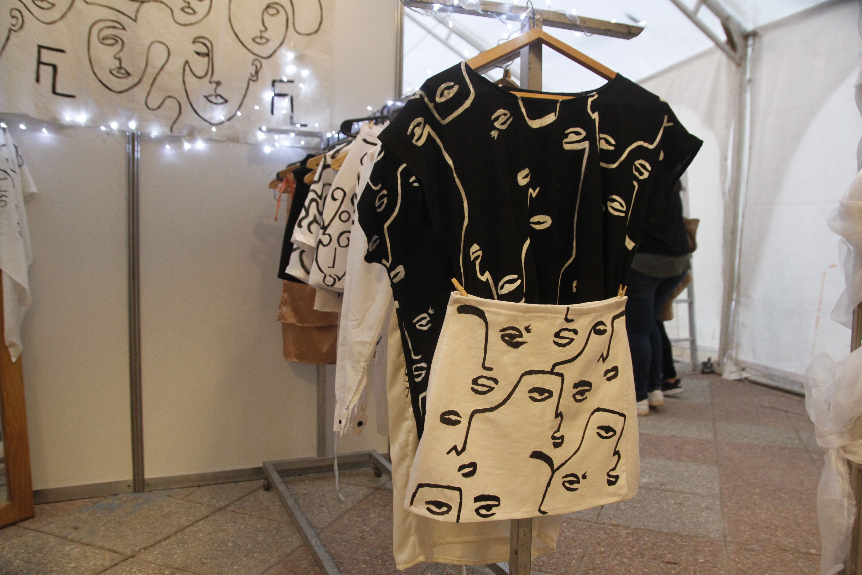 Fine Line. Falda hecha con gabardina, con talles de S a L y remera de fibrana. Diseño de indumentaria original, de Victoria Costa, dependiendo el modelo, va desde $1.000 y $1.400.