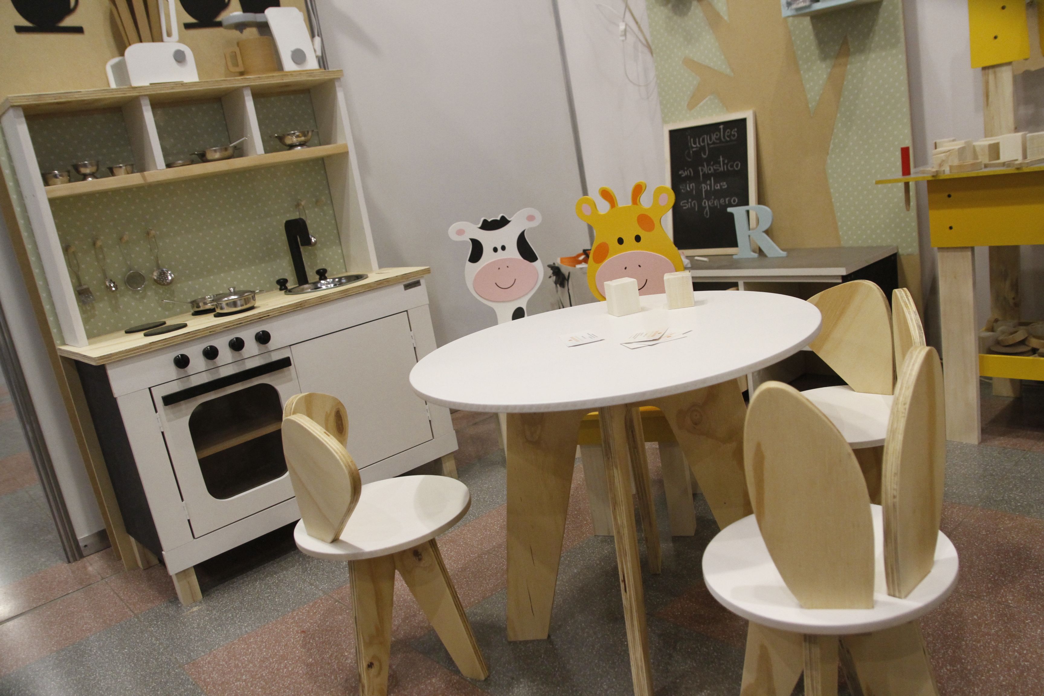 Cuarto Creciente. Emprendimiento de Estrella Sánchez. Propone una línea de muebles de madera y juguetes sin género, con producciones a pedido personal. Esta cocina sin sus accesorios cuesta $8.500 y el juego de mesa con dos sillas $7.500; lámparas $1.700.