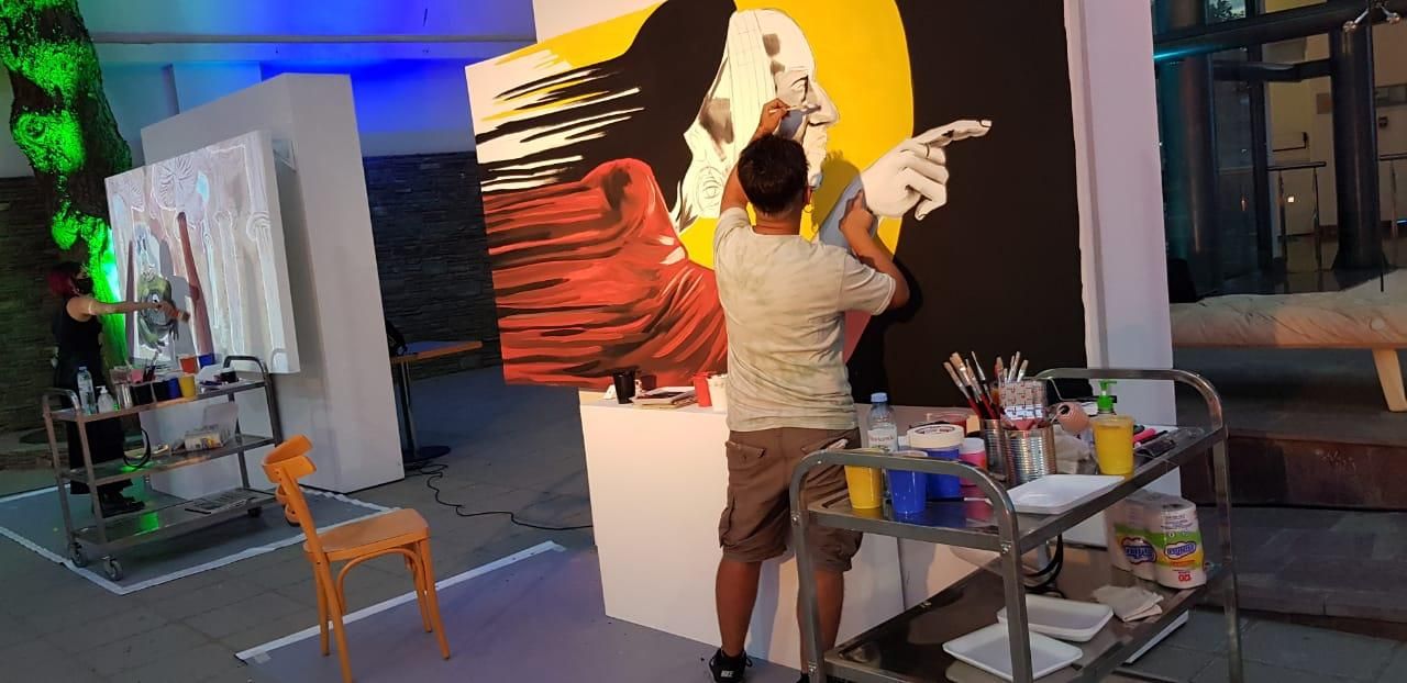 Una gran intervención en la explanada del edificio le dio la bienvenida a la quinta entrega de "La noche del dibujo", pensada por el Museo Provincial de Bellas Artes Franklin Rawson, con la producción de Mercedes Yacante, Matías Ruarte, Lucas Sepúlveda y Juan Manuel Noguera. El viernes pasado, estos artistas dejaron plasmada su producción, en una jornada que comenzó a las 18 y continuó hasta las 22, a la vista de transeúntes ocasionales y automovilistas que decidieron detenerse para observar, desde sus coches.