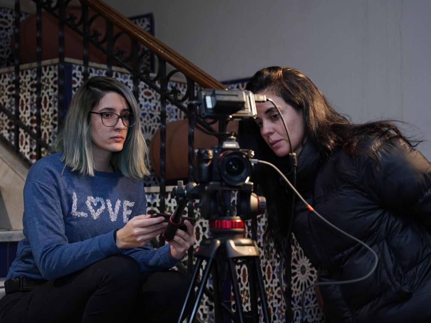Marina Zeghaib, a cargo de la codirección (con Ramiro Reinoso) supervisa tomas junto a a María Artero, directora de fotografía.