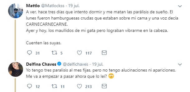 Esa fue la respuesta al tweet de un joven que decía: “A ver, hace tres días que intento dormir y me matan las parálisis de sueño. El lunes fueron hamburguesas crudas que estaban sobre mi cama y una voz decía CARNECARNECARNE”.