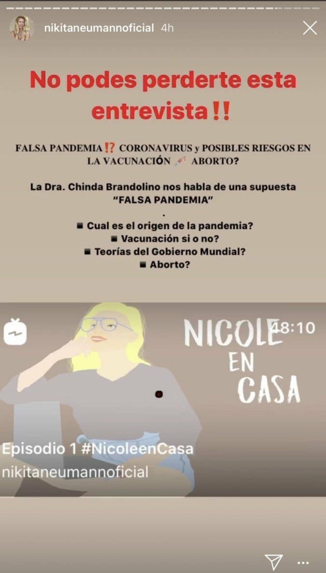 "Esto es el mundo hoy por coronavirus. Un virus que enferma y mata para el cual no hay aún ni cura ni vacuna. Pero Nikita se queda en casa haciéndole una nota a una médica antivacunas”, disparó furiosa.