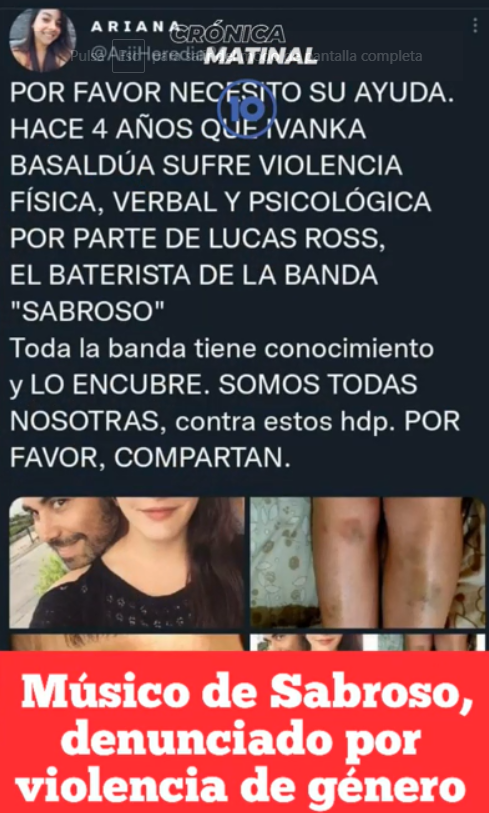 El baterista de la reconocida banda de cuarteto Sabroso, Luca Ross, está en el ojo de la tormenta después de haber sido denunciado por su expareja, Ivanka Basaldúa, por violencia de género. Al parecer, las demandas fueron constantes a lo largo de los cuatro años y medio que duró su relación. La mujer relató que Ross cometió agresión psicológica, verbal y física contra ella.