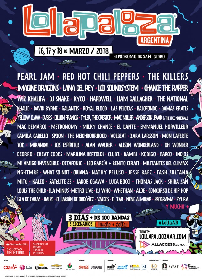 Pearl Jam, Red Hot Chili Peppers, The Killers, Imagine Dragons, Lana Del Rey, LCD Soundsystem, Chance The Rapper, Wiz Khalifa, DJ Snake, Mac Demarco, Kygo, Hardwell, Liam Gallagher, The National y David Byrne encabezan la grilla del festival internacional más grande que se lleva a cabo en el país, que en esta nueva edición se extenderá por tres días.