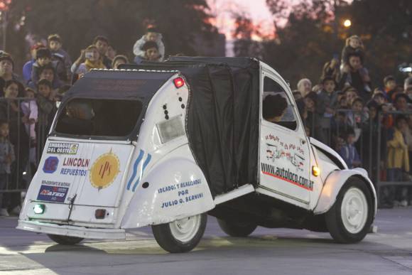 En un frío atardecer los motores de los Autos Locos entibiaron a los cientos de sanjuaninos que ayer asistieron a la Ferichicos para disfrutar de la exhibición de la flota de vehículos más desopilante. Al ritmo del 2×4, El Fuelle de Pichuco (en honor a Troilo), un Citroën con complejo de bandoneón abrió el desfile de La troupe de los Autos Locos de Lincoln. Después vinieron Rana y Bailarín cuya gracia justamente es saltar, y el pequeño Giro con tornillo que puso a su conductor literalmente de cabeza. El encuentro de la noche es entre El ratón loco y La bolita loca se enfrentaron en un duelo y el Taxi loco sacudió a sus pasajeros.