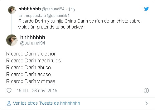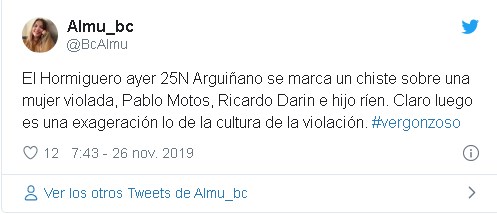 “El patriarcado no se acabará tan fácilmente mientras un gilipollas haga chistes de violaciones y otros tres gilipollas le rían la gracia en un programa de televisión”, disparó una usuaria de Twitter. “Cuenta un ‘chiste’ sobre una violación y una mesa en la que Pablo Motos, Ricardo Darín y su hijo Chino Darín sólo saben reírse ante tal gesto de mal gusto. Ninguno es capaz de alzar la voz y pedirle que se calle. Repugnante”, sumó otra.
