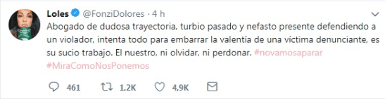"Abogado de dudosa trayectoria. Turbio pasado y nefasto presente defendiendo a un violador. Intenta todo para embarrar la valentía de una víctima denunciante, es sucio su trabajo. El nuestro, ni olvidar ni perdonar. #NoVamosAParar #MiráCómoNosPonemos", escribió firme la actriz.