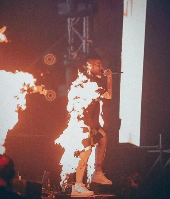 La adrenalina del show fue tal que en un momento las llamas alcanzaron al cantante y esto quedó registrado en una foto que se difundió a modo de meme en Twitter.