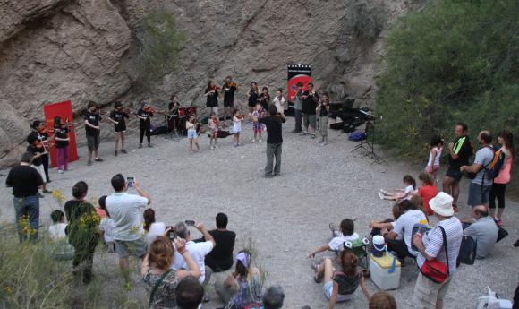 El color del atardecer irradió magia por las erosionadas formas que presentan los cerros de Zonda y por su parte, los violines de Pequeña Ala – Imagen del Sonido, repartieron dulces melodías en un espacio ideal donde confluyeron la música con la naturaleza. Sobre la llamada Quebrada de Juan Pobre, los 23 artistas de diferentes edades (desde los 5 hasta los 50 años) que conforman el elenco, realizaron un espectáculo con un escenario natural insuperable. El grupo interpretó piezas infantiles y obras clásicas de Bach y Haydn. Además, ejecutaron la pieza "Fantasma", composición propia del taller de violín que es dirigido por el profesor Guillermo Heredia. La idea de tocar en un espacio natural residió en: "este grupo de alumnos de violín están aprendiendo la contextualización de hacer música en un medio cultural. El violín está vinculado a la cultura europea y en espacios selectos; de manera que queremos hacer una ruptura de eso", dijo el profesor. "Estuvimos preparando este concierto a lo largo de un año y medio de estudio en el curso. Es un desarrollo veloz en tiempo y en calidad’, agregó. Entre cada intervención instrumental de los protagonistas del show, el aplauso de los padres no se hizo esperar. Muchos familiares llegaron con viandas, conservadoras, mate y bebidas para acompañarlos en una agradable tarde de cultura en contacto con la naturaleza sanjuanina. (Ver galería de imágenes en www.diariodecuyo.com.ar)