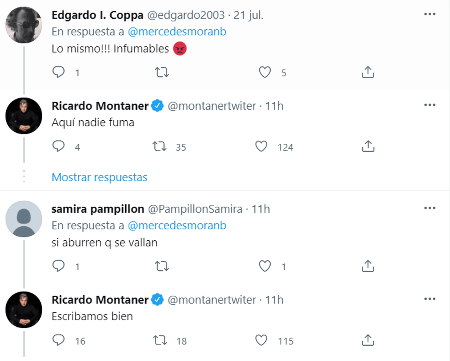 Un seguidor le pidió que se bancara la opinión de Morán y lo cuestionó por difundir la idea de “un Dios castigador”. Otro dijo que los Montaner eran infumables, y el intérprete se burló: “Aquí nadie fuma”. Lo más picante llegó cuando alguien le dejó un comentario con una falta de ortografía: “Sí aburren. Que se vallan”. Él no lo toleró y dijo: “Escribamos bien”.