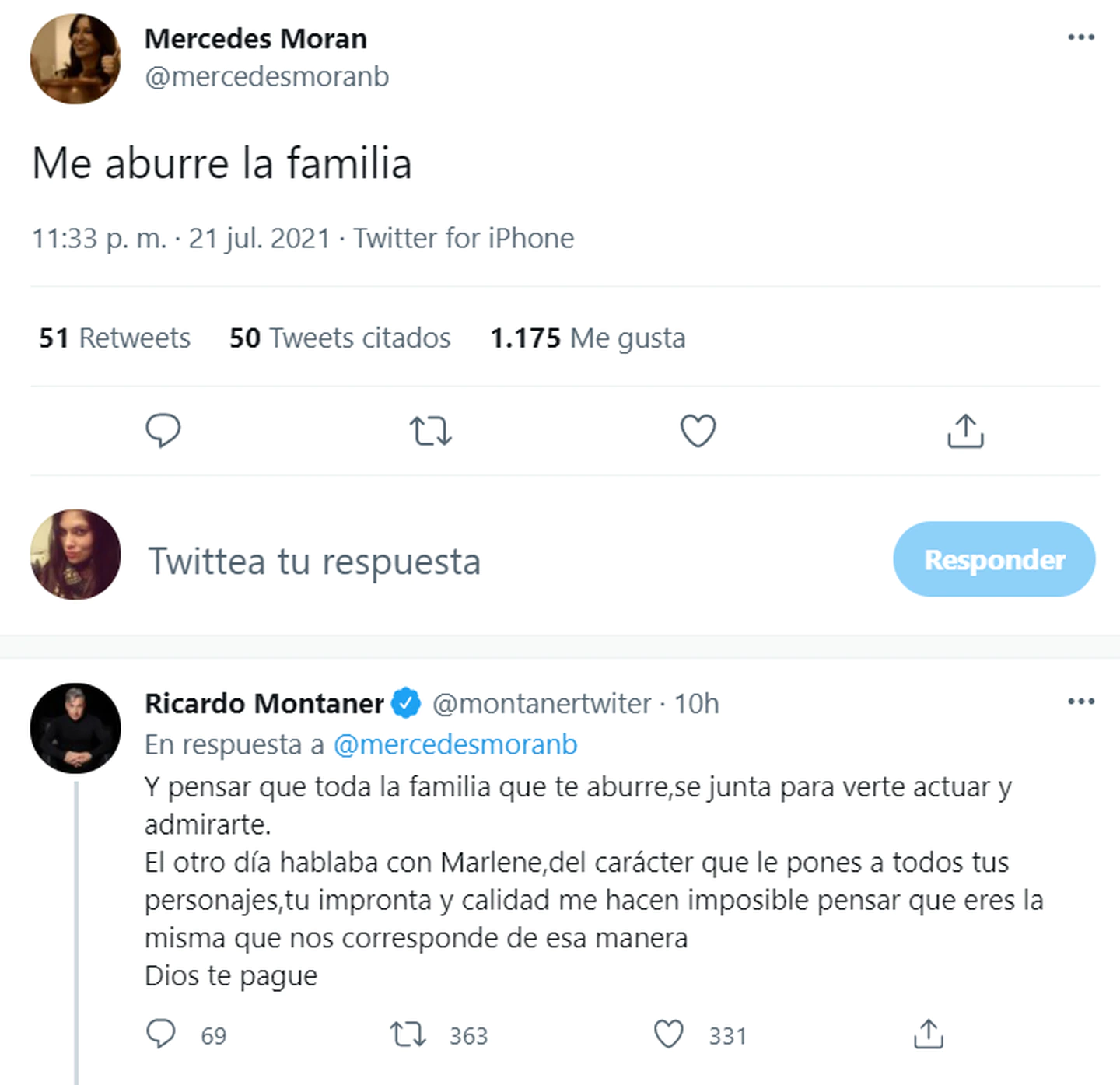 “Y pensar que toda la familia que te aburre se junta para verte actuar y admirarte. El otro día hablaba con Marlene del carácter que le pones a todos tus personajes. Tu impronta y calidad me hacen imposible pensar que eres la misma que nos corresponde de esa manera. Dios te pague”, respondió molesto.