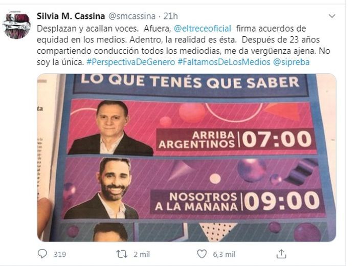 "Desplazan y acallan voces. Afuera, @eltreceoficial firma acuerdos de equidad en los medios. Adentro, la realidad es ésta. Después de 23 años compartiendo conducción todos los mediodías, me da vergüenza ajena. No soy la única", escribió la Cassina junto a los hashtags #PerspectivaDeGenero #FaltamosDeLosMedios y una captura del diario.