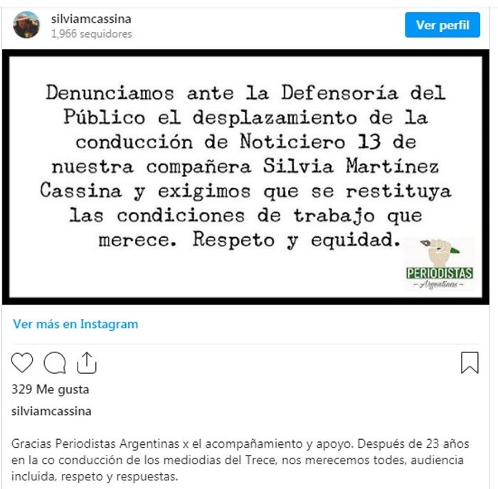“Denunciamos ante la Defensoría del Público el desplazamiento de la conducción de Noticiero 13 de nuestra compañera Silvia Martínez Cassina y exigimos que se restituya las condiciones de trabajo que merece. Respeto y equidad”, dice el comunicado de Periodistas Argentinas que la propia conductora compartió en su cuenta de Instagram.