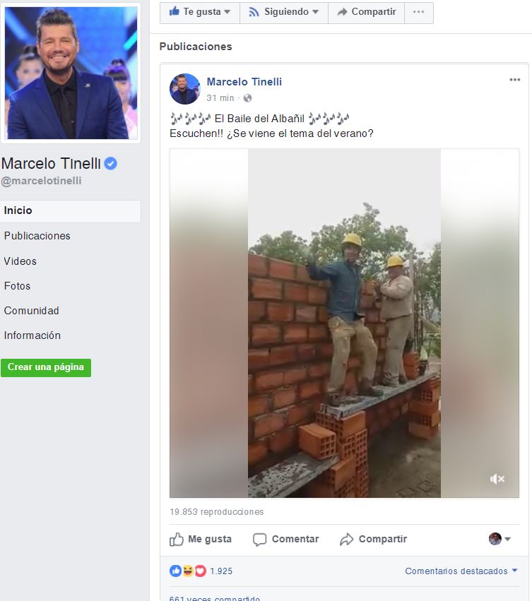 El reconocido conductor de TV publicó en su cuenta de la red social “El Baile del Albañil. Escuchen!! ¿Se viene el tema del verano?” y en pocos minutos fue compartido y comentado por muchas personas de todo el país.