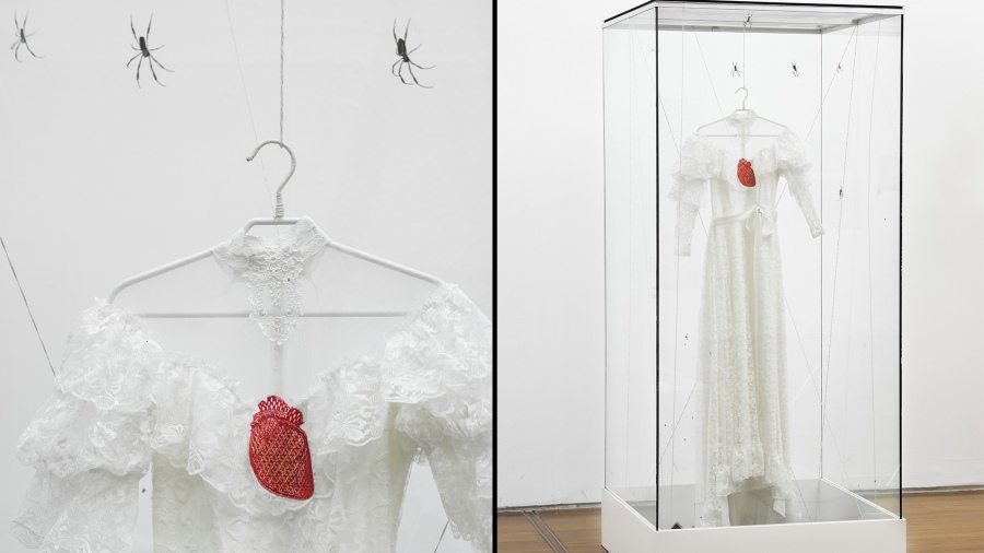 Días atrás, el Museo había mostrado en Instagram a las arañas moverse dentro de la obra, bajo la leyenda: "El tejido tradicional es un elemento identitario del Paraguay. Comunidades enteras construyen alrededor del tejido su sustento simbólico y económico. En su obra, Joaquín Sánchez recupera y reinterpreta este mundo fundado en un trabajo artesanal mediante un corazón hecho de ñandutí -símbolo importante de Paraguay- sobre un vestido de novia encerrado en una caja de vidrio. Alrededor, unas arañas tejen su tela, invocando la palabra guaraní que da nombre a este tipo de encaje. En esa imposición del corazón hay una puntualización: el lugar que ocupa el matrimonio en la asignación social que se les da a las mujeres y la vida entregada a la tarea de bordar y ser sostén familiar".