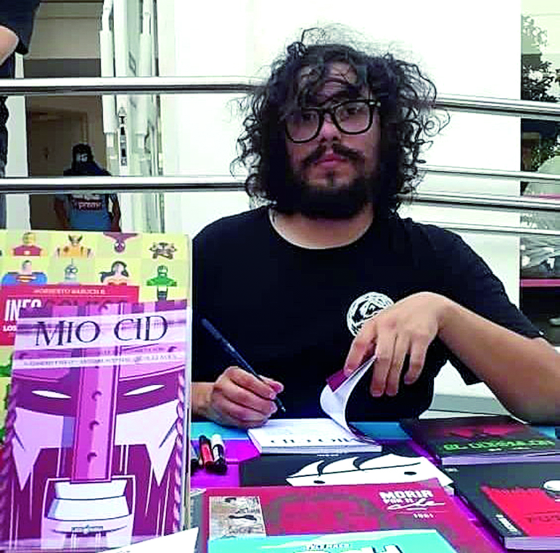 Acevedo. el ilustrador en la presentación del libro en Buenos Aires, donde las ilustraciones, los lápices y las tintas son suyas, los escritos de Farías y los grises de Nicolás Ávila.