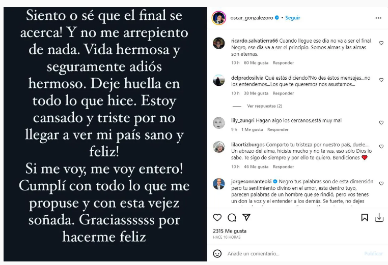 “Siento o sé que el final se acerca. Y no me arrepiento de nada. Vida hermosa y seguramente un adiós hermoso. Dejé huella en todo lo que hice. Estoy cansado y triste por no llegar a ver mi país sano y feliz. Si me voy, me voy entero. Cumplí con todo lo que me propuse y con esta vejez soñada. Gracias por hacerme feliz”, expresó en su cuenta de Instagram.