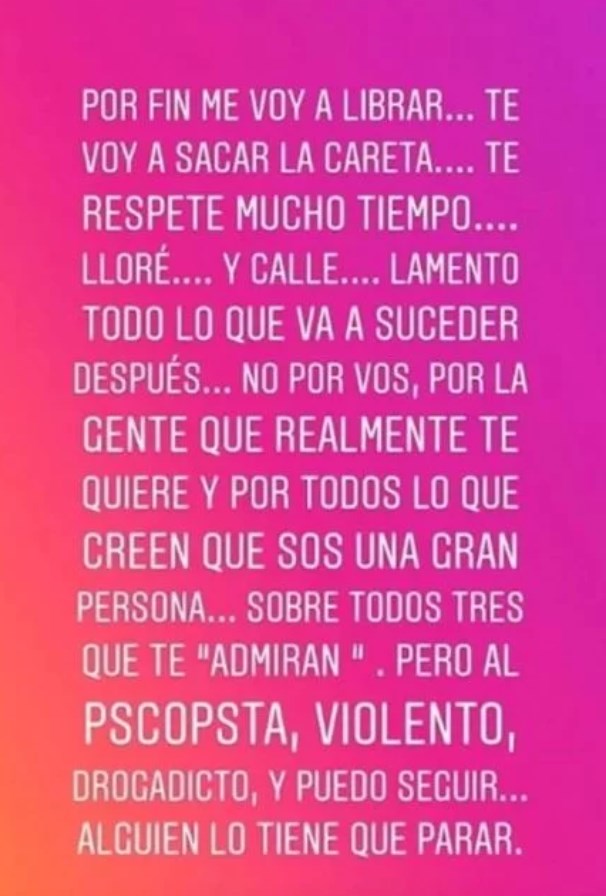 “Por fin me voy a librar. Te voy a sacar la careta. Te respeté mucho tiempo. Lloré y callé. Lamento todo lo que va a suceder después, no por vos, sino por toda la gente que realmente te quiere y por todos los que creen que sos una gran persona, sobre todo tres que te ‘admiran’”, decía el texto y terminaba en forma directa: “Pero al psicópata, violento, drogadicto, y puedo seguir, alguien lo tiene que parar”.