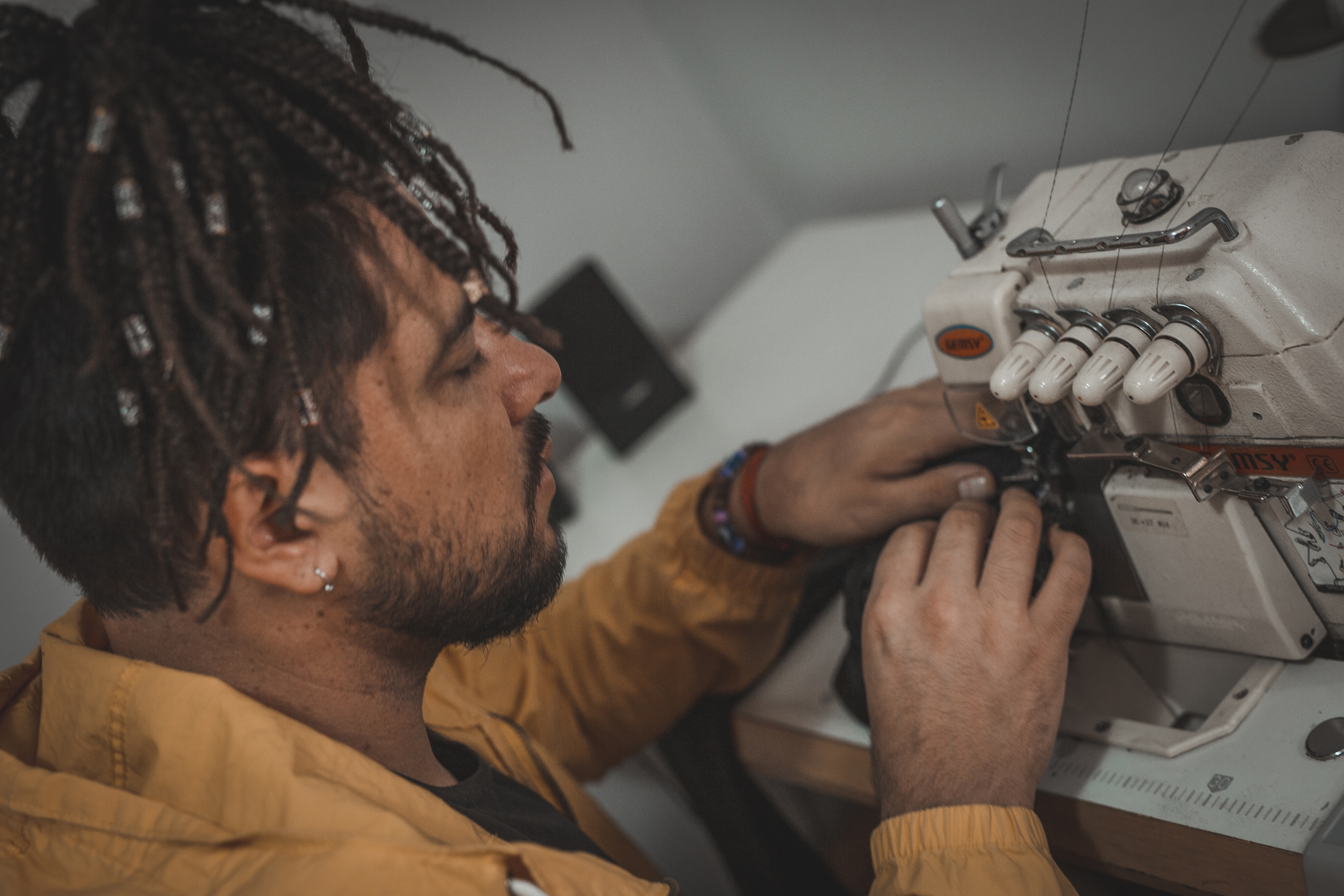 JOHNNY COMBO. Trabajando en su máquina de coser.
