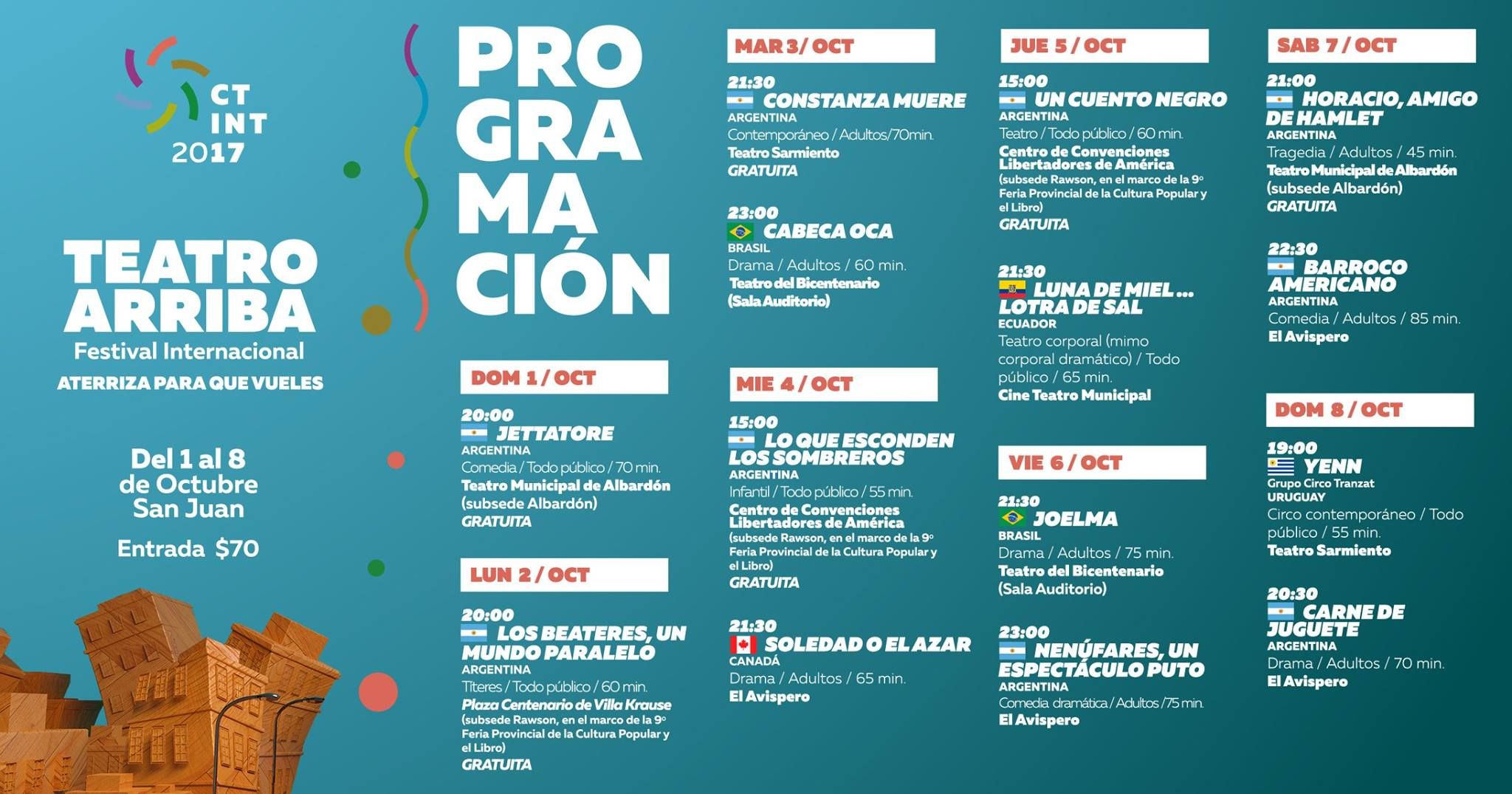 Del 1 al 8 de octubre San Juan será sede de una nueva edición de "Teatro Arriba", el circuito de teatro más importante de Argentina que comprende reconocidas obras nacionales e internacionales (de Brasil, Ecuador, Canadá y Uruguay) para todos los gustos.