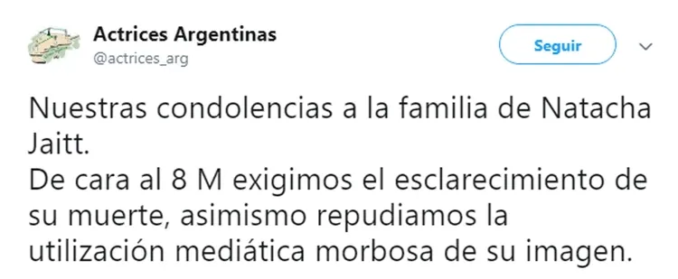 "Nuestras condolencias a la familia de Natacha Jaitt. De cara al 8 M exigimos el esclarecimiento de su muerte, asimismo repudiamos la utilización mediática morbosa de su imagen", fue el tuit que escribieron desde Actrices, además de replicar un mensaje del 14 de enero en el que apoyaban la denuncia por violación que había realizado la mediática días antes.
