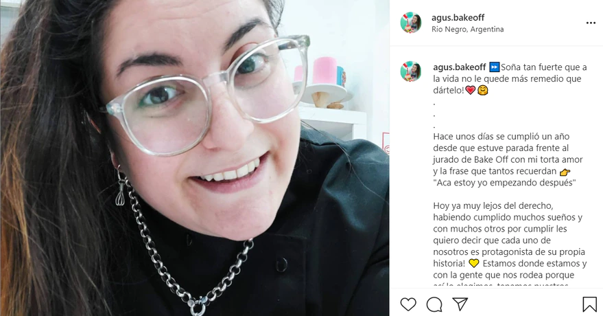 “¡Soñá tan fuerte que a la vida no le quede más remedio que dártelo!”, escribió ella. “Hace unos días se cumplió un año desde que estuve parada frente al jurado de Bake Off con mi ‘torta amor’ y la frase que tantos recuerdan: ‘Acá estoy yo empezando después’”.
