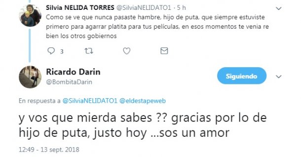 Sin escrúpulos, la usuaria le escribió: “Como se ve que nunca pasaste hambre, hijo de puta, que siempre estuviste primero para agarrar platita para tus películas, en esos momentos te venia re bien los otros gobiernos”.