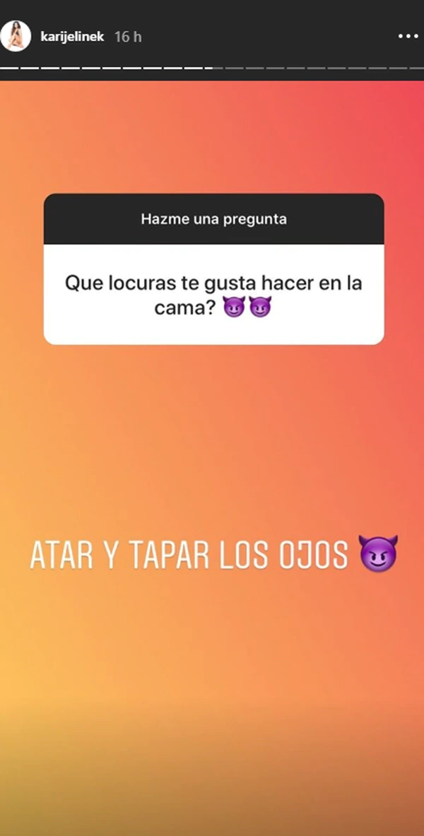 Luego le preguntaron qué locuras le gustaba hacer en la cama y ella confesó: "Atar y tapar los ojos", acompañando su respuesta con el emoji de un diablito.