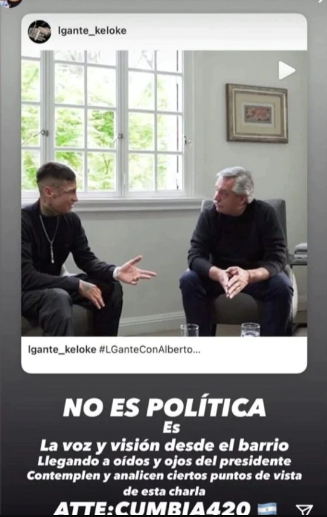 Para finalizar, y en otra historia, L-Gante agregó que “No es política, es la voz y visión desde el barrio. Llegando a oídos y ojos del presidente. Contemplen y analicen ciertos puntos de vista de esta charla. Atte: Cumbia420″.