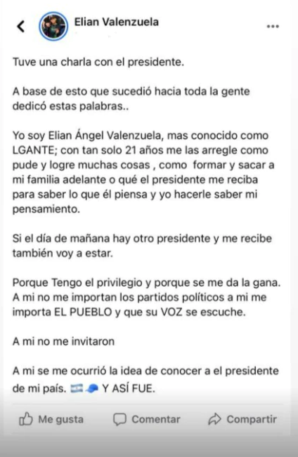 Con un posteo que luego compartió en sus historias de Instagram, L-Gante aseguró que “Tuve una charla con el Presidente. A base de esto que sucedió hacia toda la gente dedico estas palabras”.