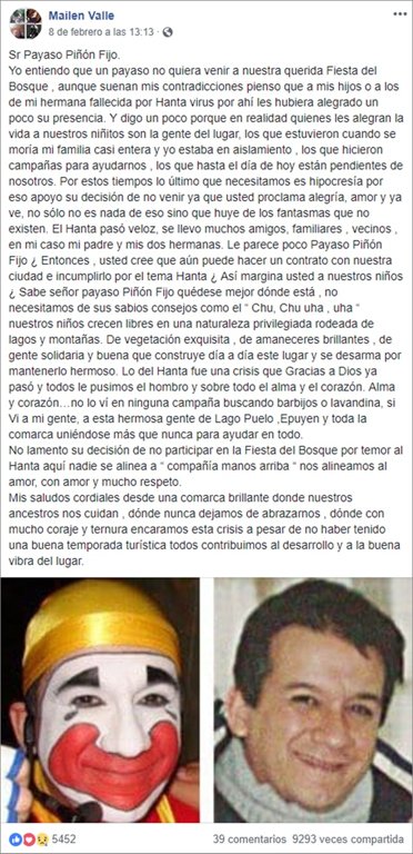 En el video, Piñón apuntó en primer lugar a los medios por poner el foco de atención en la “una polémica suscitada por el escrito de una señora que tuvo la desgracia de perder varios familiares” y no en las consecuencias del virus mortal. Según contó el payaso, en noviembre de 2018 le llegó la invitación para participar en la Fiesta del Bosque, en Lago Puelo. Sin embargo, cuando en diciembre aparecieron los primeros casos de hantavirus, el gobierno provincial de Chubut tomó la medida de suspender todos los festivales.