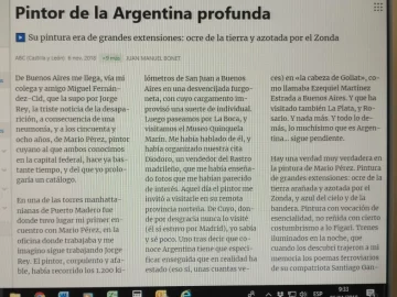 En una de las torres manhattanianas de Puerto Madero fue donde tuvo lugar mi primer encuentro con Mario Pérez, en la oficina donde trabajaba y me imagino sigue trabajando Jorge Rey. El pintor, corpulento y afable, había recorrido los 1.200 kilómetros de San Juan a Buenos Aires en una desvencijada furgoneta, con cuyo cargamento improvisó una suerte de individual. Luego paseamos por La Boca, y visitamos el Museo Quinquela Marín. Me había hablado de él, y había organizado nuestra cita Diodoro, un vendedor del Rastro madrileño, que me había enseñado fotos que me habían parecido de interés. Aquel día el pintor me invitó a visitarle en su remota provincia norteña. De Cuyo, donde por desgracia nunca lo visité (él sí estuvo por Madrid), yo sabía y sé poco. Uno tras decir que conoce Argentina tiene que especificar enseguida que en realidad ha estado (eso sí, unas cuantas veces) en «la cabeza de Goliat», como llamaba Ezequiel Martínez Estrada a Buenos Aires. Y que ha visitado también La Plata, y Rosario. Y nada más. Y todo lo demás, lo muchísimo que es Argentina… sigue pendiente.