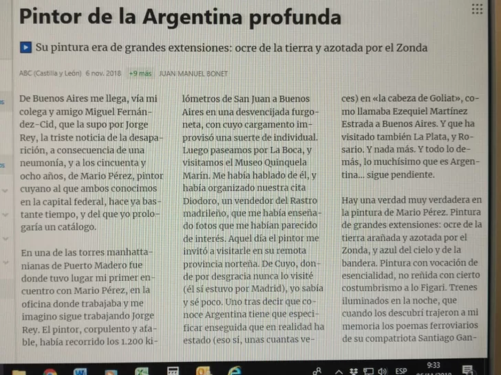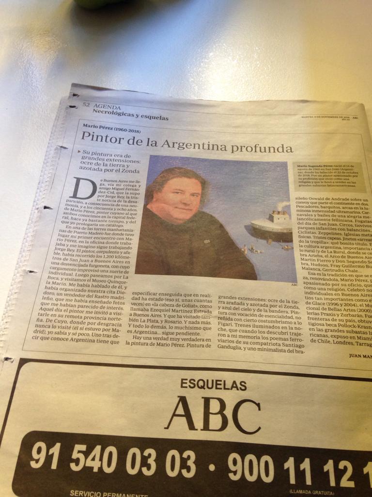 El pasado 22 de octubre y luego de luchar contra neumonía, falleció Mario Pérez, uno de los artistas más importantes de la historia sanjuanina y también argentina. Su partida no sólo conmocionó al ambiente artístico provincial y nacional, sino que la noticia llegó al Viejo Continente y este martes salió publicada una nota sobre él en el prestigioso diario ABC, uno de los más importantes de habla hispana.