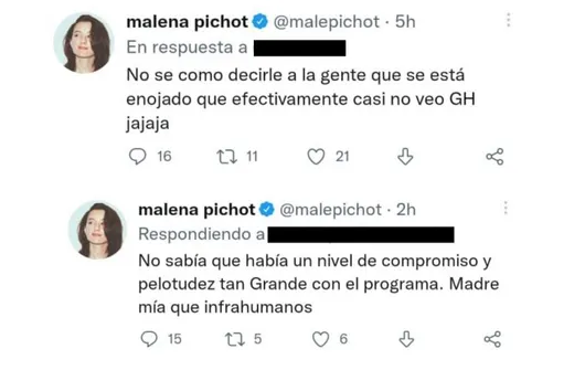 Los usuarios de la red social del pajarito no tomaron para nada bien sus comentarios sobre el reality y la liquidaron. "Que risa Malena Pichot, borró el tuit porque efectivamente nunca ve Gran Hermano y habla por hablar", dijo uno. "Malena Pichot siendo patética, no importa cuando veas este tweet", sostuvo otro.