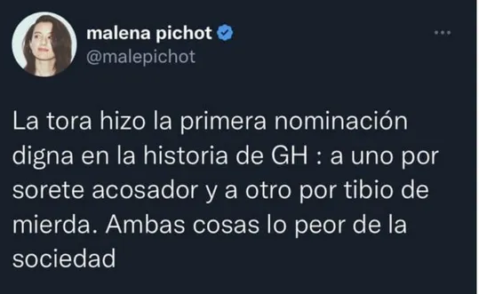 "La Tora hizo la primera nominación digna en la historia de Gran Hermano: a uno por sorete acosador y a otro por tibio de mierda. Ambas cosas lo peor de la sociedad", sostuvo Malena Pichot en Twitter, refiriéndose a la situación entre Alfa y Coti.