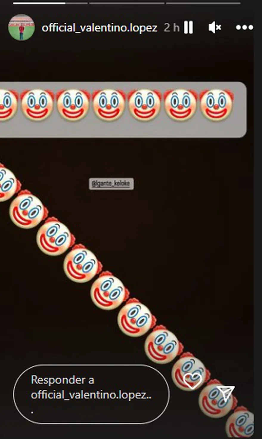 Alrededor de las 17 de la Argentina, el joven compartió una historia que llenó de emojis de payasos y etiquetó la cuenta oficial de Elián Valenzuela, mejor conocido como L-Gante.